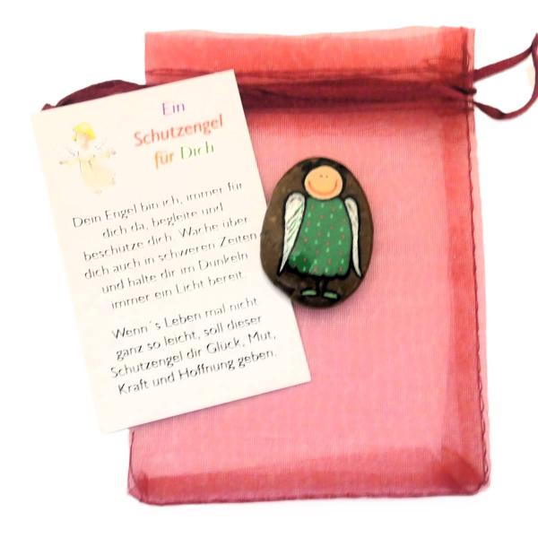 Der gelieferte Schutzengel-Stein ist ca. 4 - 5 cm groß. Der Schutzengel wird in einem Organza- Säckchen incl. einer Geschenkkarte geliefert. Hier bekommst du deinen persönlichen Schutzengl von Hand auf Stein gemalt. Der gelieferte Schutzengel Stein kann in Form und Farbe vom gezeigten Foto abweichen, da jeder Stein einzigartig ist. Auf den Bildern sind Beispielsteine, Serienmodelle oder Figuren zu sehen.
