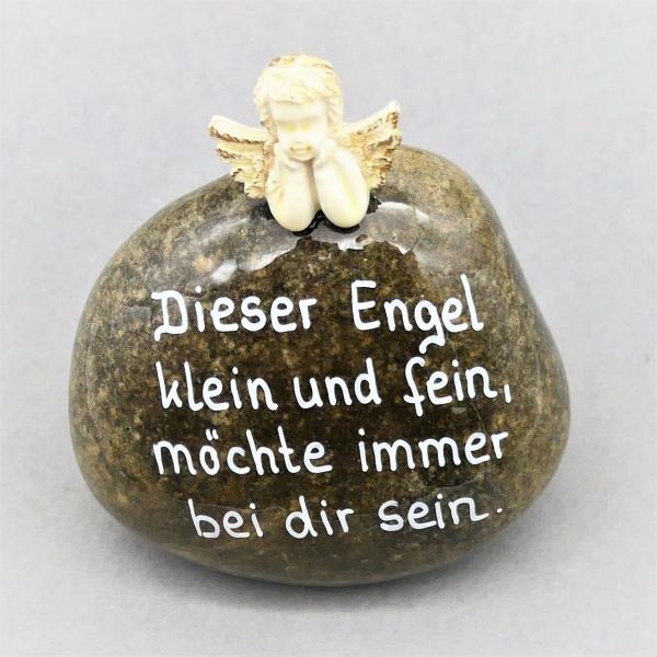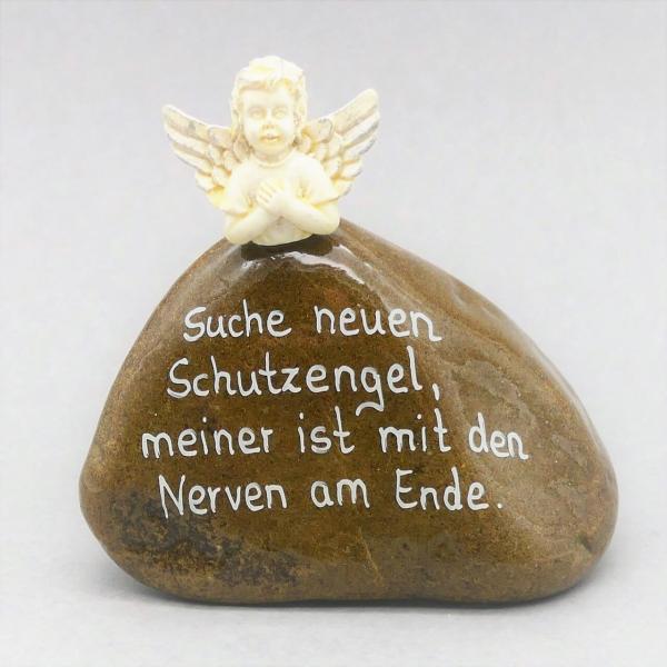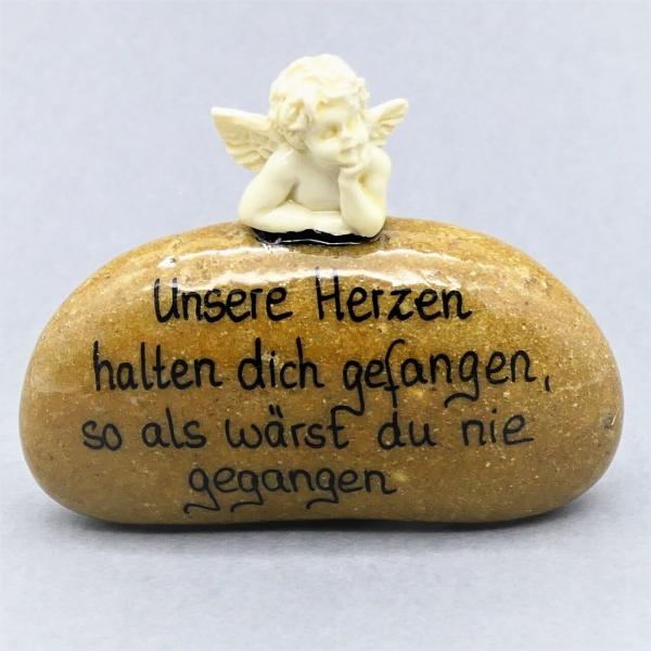 Der Engel ist aus Polyresin und sitzt auf dem Stein, danach wird er lackiert und mit einem Wunschtext von beschriftet. Der gelieferte Stein kann in Form, Farbe und Engel vom Foto abweichen, da jeder Stein ein Einzelstück ist. Auf den Bildern sind Musterbeispiele zu sehen.